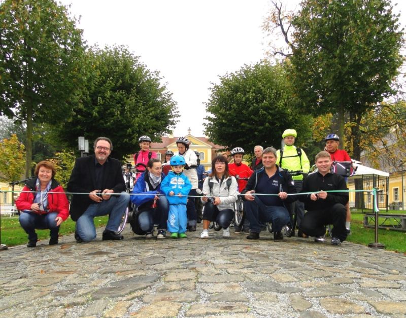 Nachdem mit dem Durchschneiden des Bandes die Radrouten symbolisch eröffnet wurden, machte sich die Radlergruppe entlang der Naturerlebnisroute auf den Weg nach Bischofswerda, wo sie von den dortigen Gästen auf dem Altmarkt bereits erwartet und mit dem Lied „Ja, wir san mitn Radl da“ empfangen wurden.