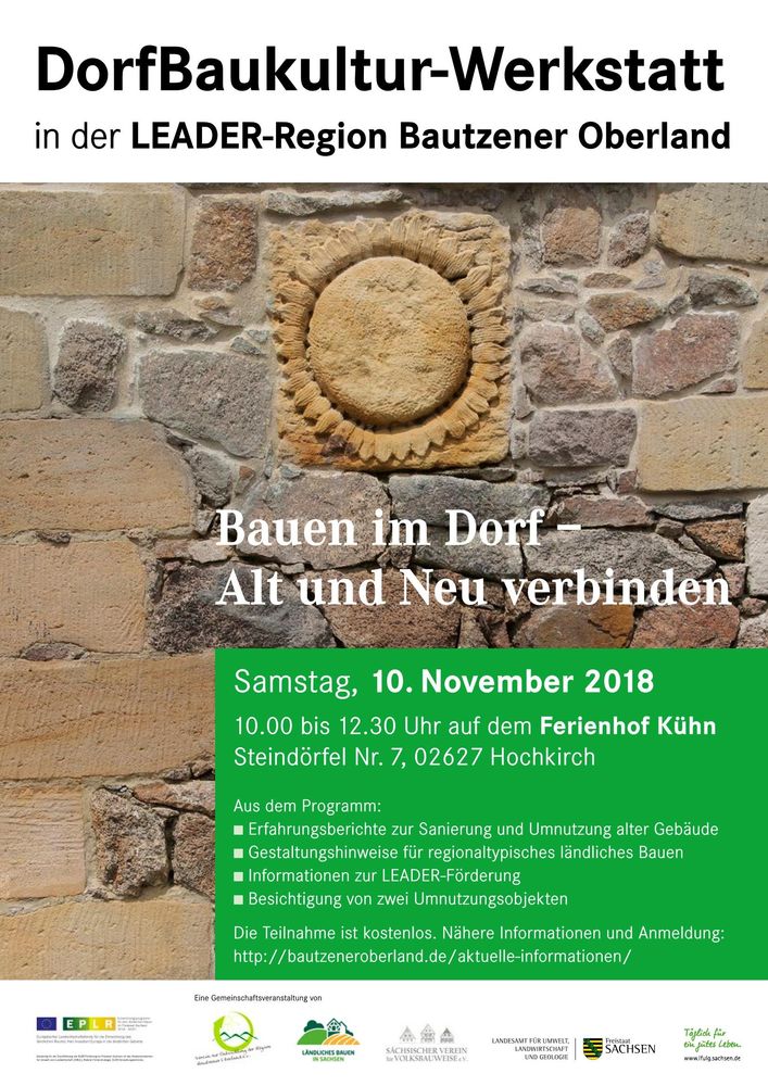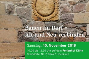 Dazu findet am Sonnabend, den 10. November 2018 eine Informationsveranstaltung mit abwechslungsreichem Programm in unserer Nachbarregion Bautzener Oberland, in Steindörfel statt:[nbsp] Architekten geben Ratschläge, wie sich regionaltypische Elemente auch in einem neuen Haus wiederfinden können. Für Liebhaber und Besitzer alter Häuser stellt die Stiftung Umgebindehaus ihre Bauteilbörse vor und Bauherren berichten von ihren Erfahrungen mit der Sanierung alter Bauernhöfe in der Region.