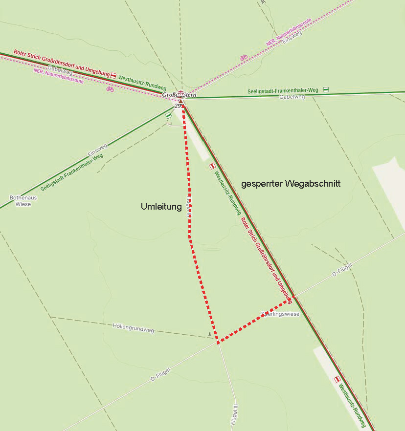 Betroffen sind die Wanderwege "Westlausitz Rundweg" und "Großröhrsdorf und Umgebung". Alternativ kann von Wanderern der auf dem Bild gestrichelt dargestellte Weg genutzt werden.