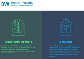 Über das Soforthilfeprogramm "Heimatmuseen und landwirtschaftliche Museen 2021" werden vom Deutschen Verband für Archäologie e. V. (DVA) Fördergelder für Museen im ländlichen Raum zur Verfügung gestellt. Fördermittel können in den Sparten "Heimatmuseen" und "Landwirtschaftliche Museen" beantragt werden. Alle Informationen gibt es auf der Website des DVA unter [...]