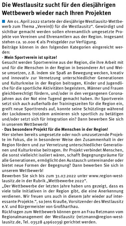 Die Westlausitz sucht für den diesjährigen Wettbewerb wieder nach Ihren Projekten