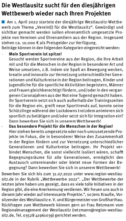 Die Westlausitz sucht für den diesjährigen Wettbewerb wieder nach Ihren Projekten