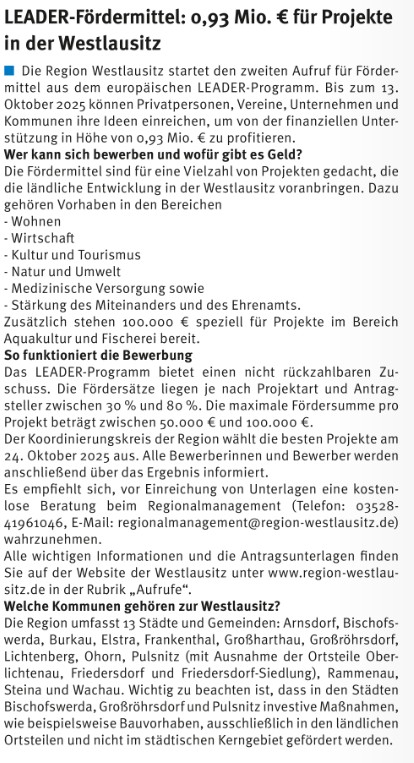 LEADER-Fördermittel: 0,93 Mio. € für Projekte in der Westlausitz