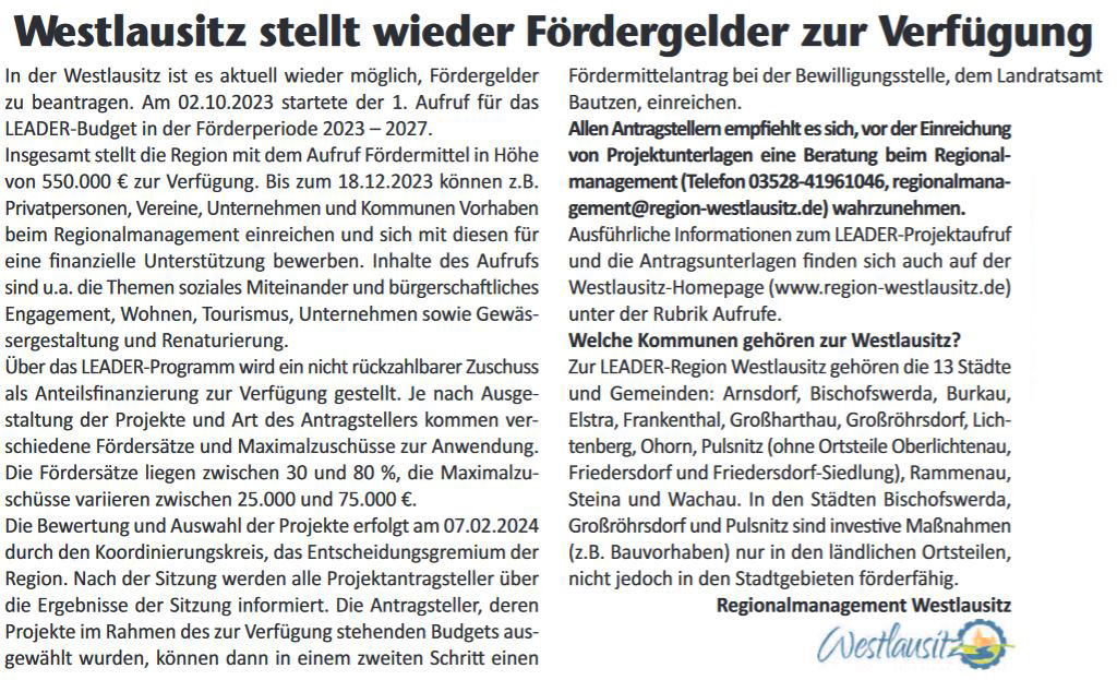 Westlausitz stellt wieder Fördergelder zur Verfügung
