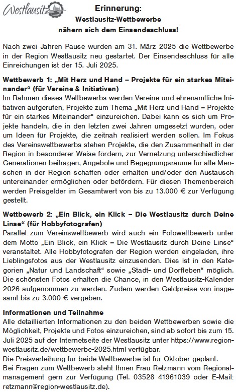 Westlausitz-Wettbewerbe nähern sich dem Einsendeschluss!